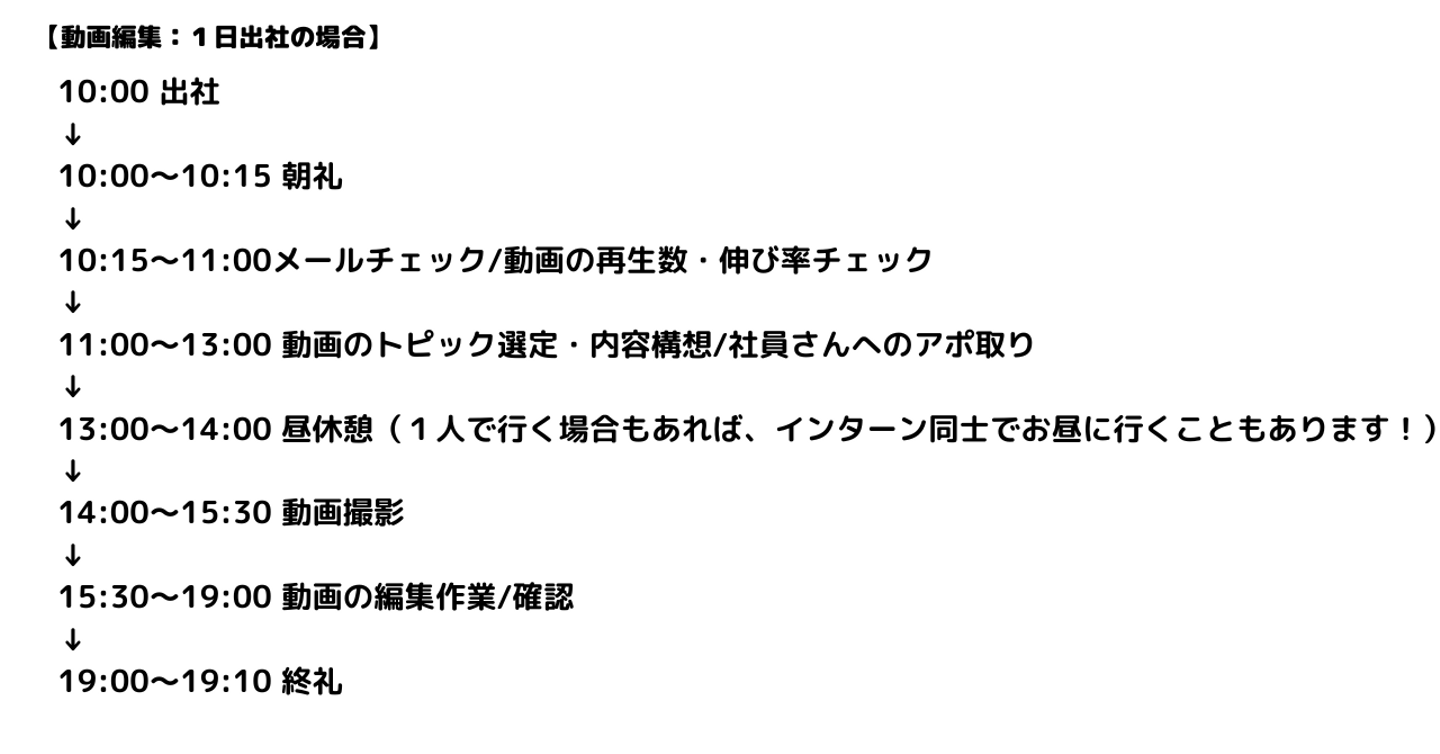 ※動画編集・Webマーケ共に、流動的に業務を行うポジションなので、毎日やることは異なります!(上記スケジュールは主な流れになります)