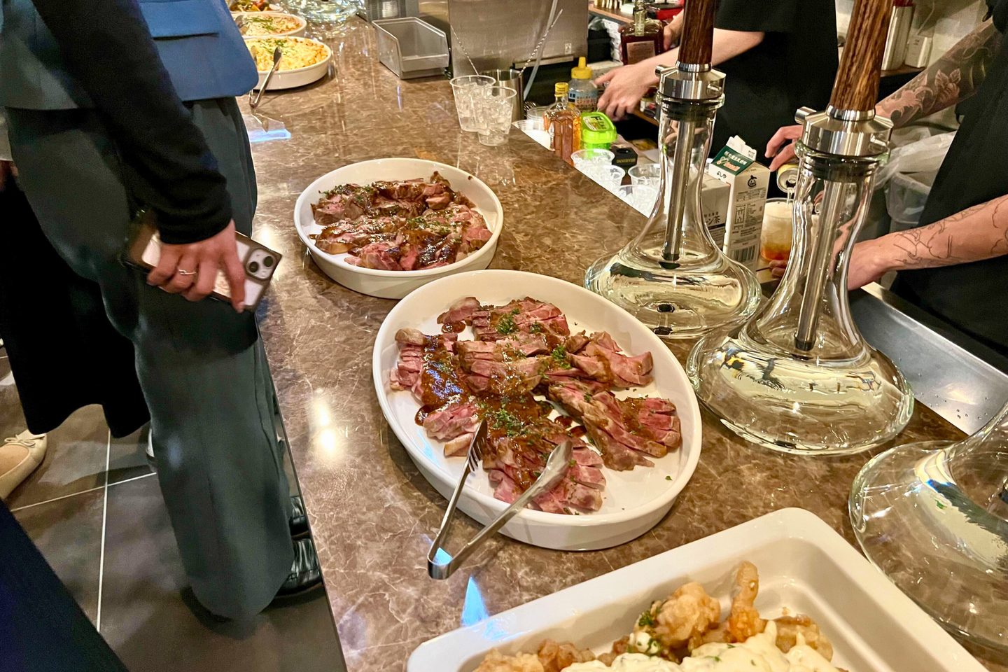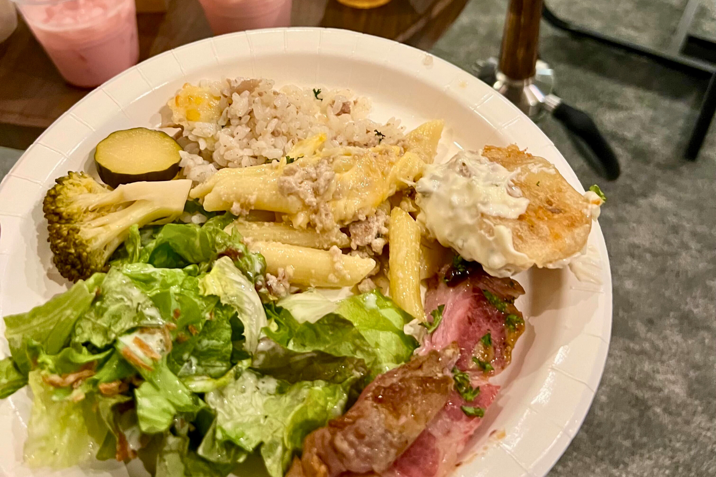 食事はビュッフェスタイルで肉料理やグラタン、ピラフなどがありました!