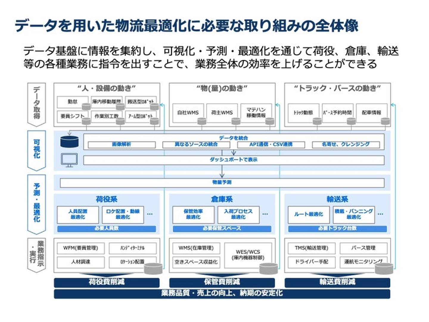 幸いなことに、物流の現場を訪れてみると、多くの業務がシステム化されていることに気がつきます。例えば倉庫ではWMS(Warehouse Management Systemの略。倉庫管理システム)、輸配送ではTMS(Transport Management Systemの略。輸配送管理システム)といったシステムはおよそ一般的になってきました。現場によっては細かいトラッキング機能が具備されていることもあり、その場合には秒単位で物の動き・人の動きがわかるようにもなっています。これらの情報を利活用することにより、意思決定の再現、最適化に取り組んできました。これは、JDSCの物流領域における成果の一つです。