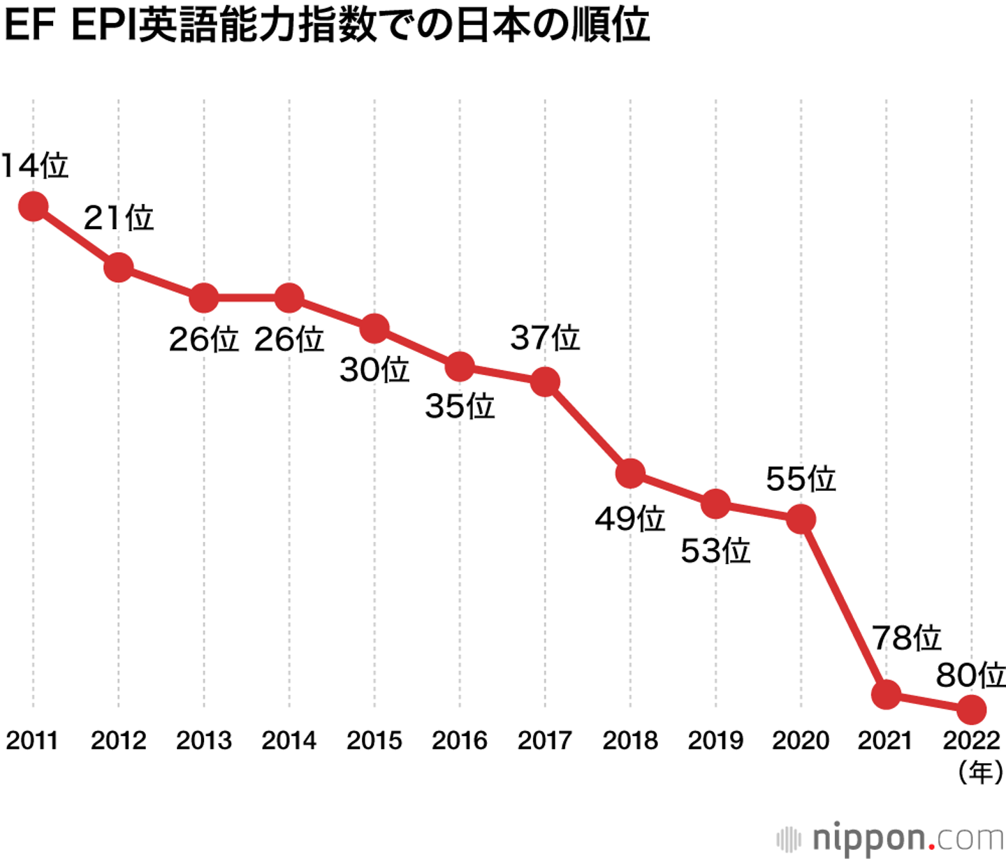 国際語学教育機関「EFエデュケーション・ファースト」(本部・スイス)がこのほど発表した2022年調査によると、英語を母語としない112カ国・地域のうち、日本人の英語力は前年の78位からさらに順位を落とし、80位となった。これは5段階中4番目となる「低い能力レベル」(61~87位)に分類される。