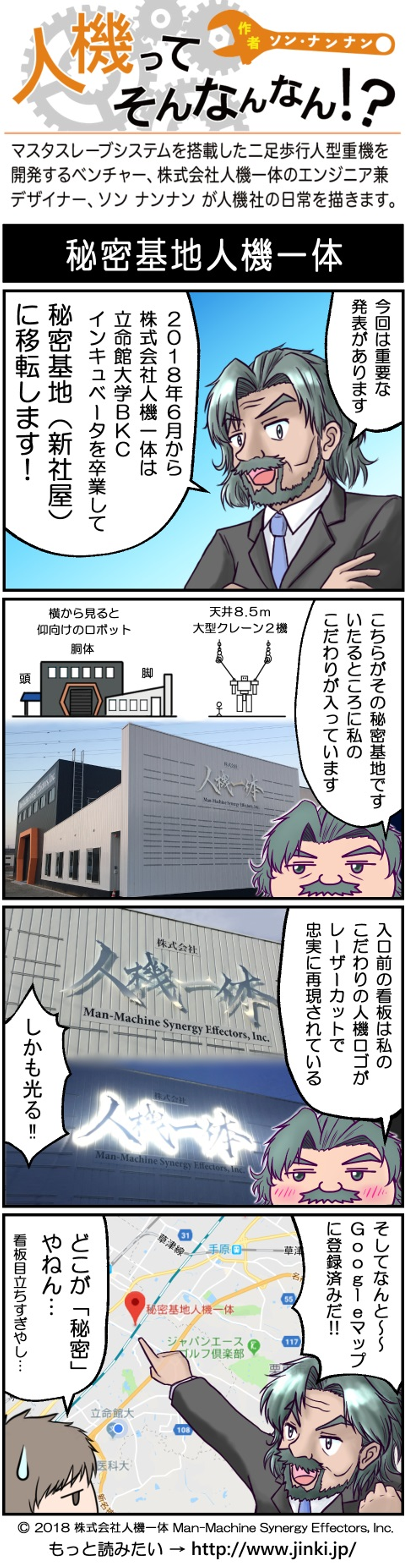 この6月から秘密基地勤務です。とはいえまだ荷ほどきをしている状態ですが(汗)。6月いっぱいは通常業務をこなしながら、オフィスの内装や開発室のロボットを整えていくことになります。四コマの通り建物自体はまったく「秘密」ではありませんが、天井クレーン 2 機とロボットが入った開発室は、正に秘密基地そのものです。