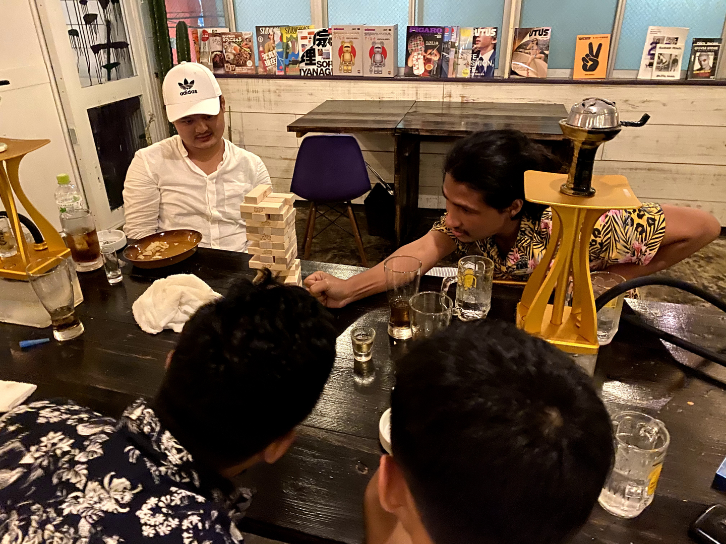 ディナー:牧志公設市場、市場本通りのジェンガが置いてあるSHISHAバー(酔いどれのため店名失念...)