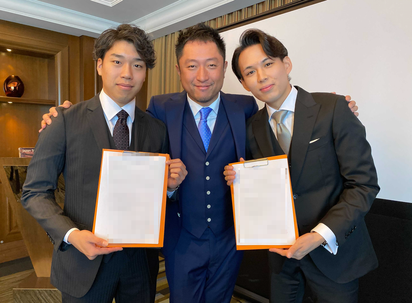 内定通知書を授与し、承諾書にサインをし、社長と新入社員ががっちり握手を交わすと、