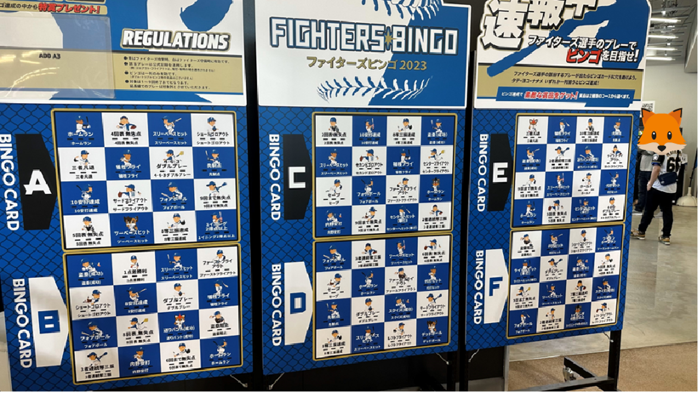 試合中ファイターズの選手の該当するプレーが出たらビンゴカードに穴を空け、縦・横・斜めいずれか1列揃ったらビンゴ達成!選手サイン入りグッズ等の豪華特典が当たるチャンス!(引用元:ファイターズ公式HP:https://www.fighters.co.jp/news/detail/202300327006.html)