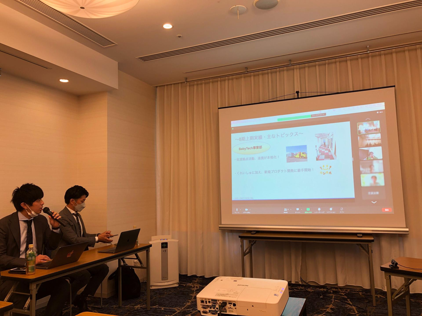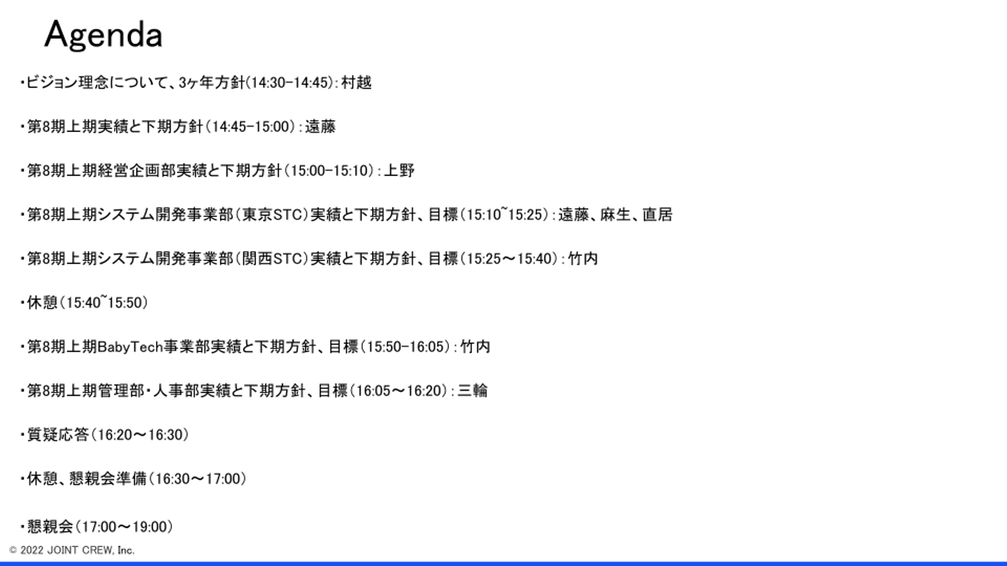 ここから各部門毎の発表に移ります。システム開発事業部(東京)の発表では技術マネージャーと営業マネージャーから、システム開発事業部(関西)と自社サービスの開発を担当するBabyTech事業部の両部門の発表は執行役員の竹内から、管理・人事・広報チームは私が担当し、それぞれ半期の振り返りと下期の方針を発表します。
