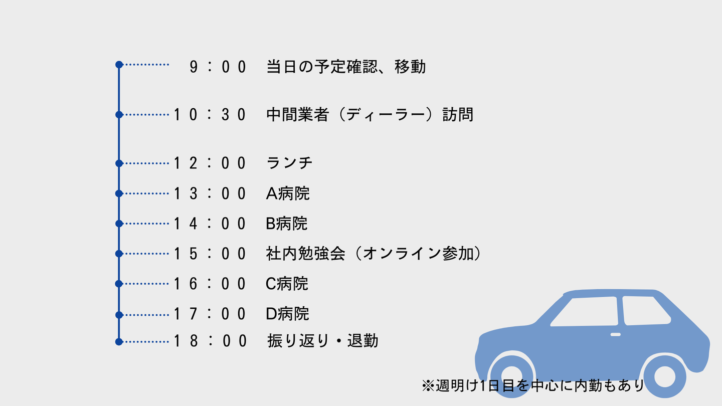 1日に5〜6件ほどの医療施設を回ることが多いです。訪問の際に診療や業務の流れを妨げないよう、時間帯を意識しながら訪問しています。