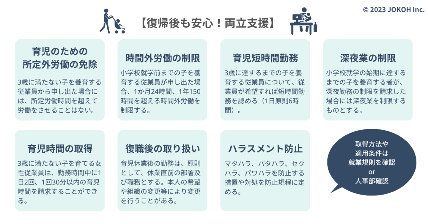 育児のための支援が必要なのは育休期間中だけではありません。育休取得前や職場復帰後も健やかに育児と仕事を両立するための法律・制度を遵守しています。