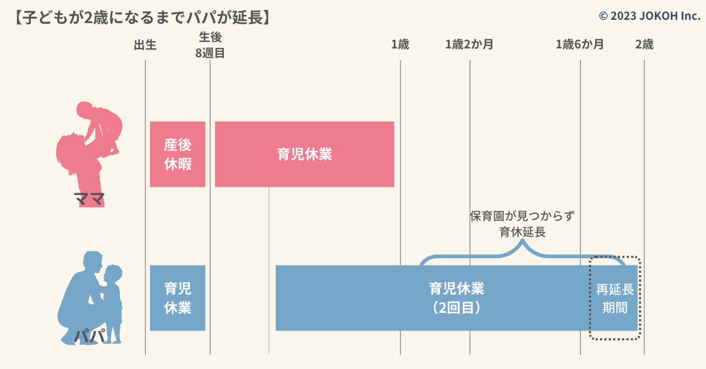 一つ前の例をさらに延長したパターンです。保育園が見つからないためパパが育児休業を2回延長し、子どもが2歳になるまで育児休業を取得します。こちらもママが2回延長することももちろん可能です。