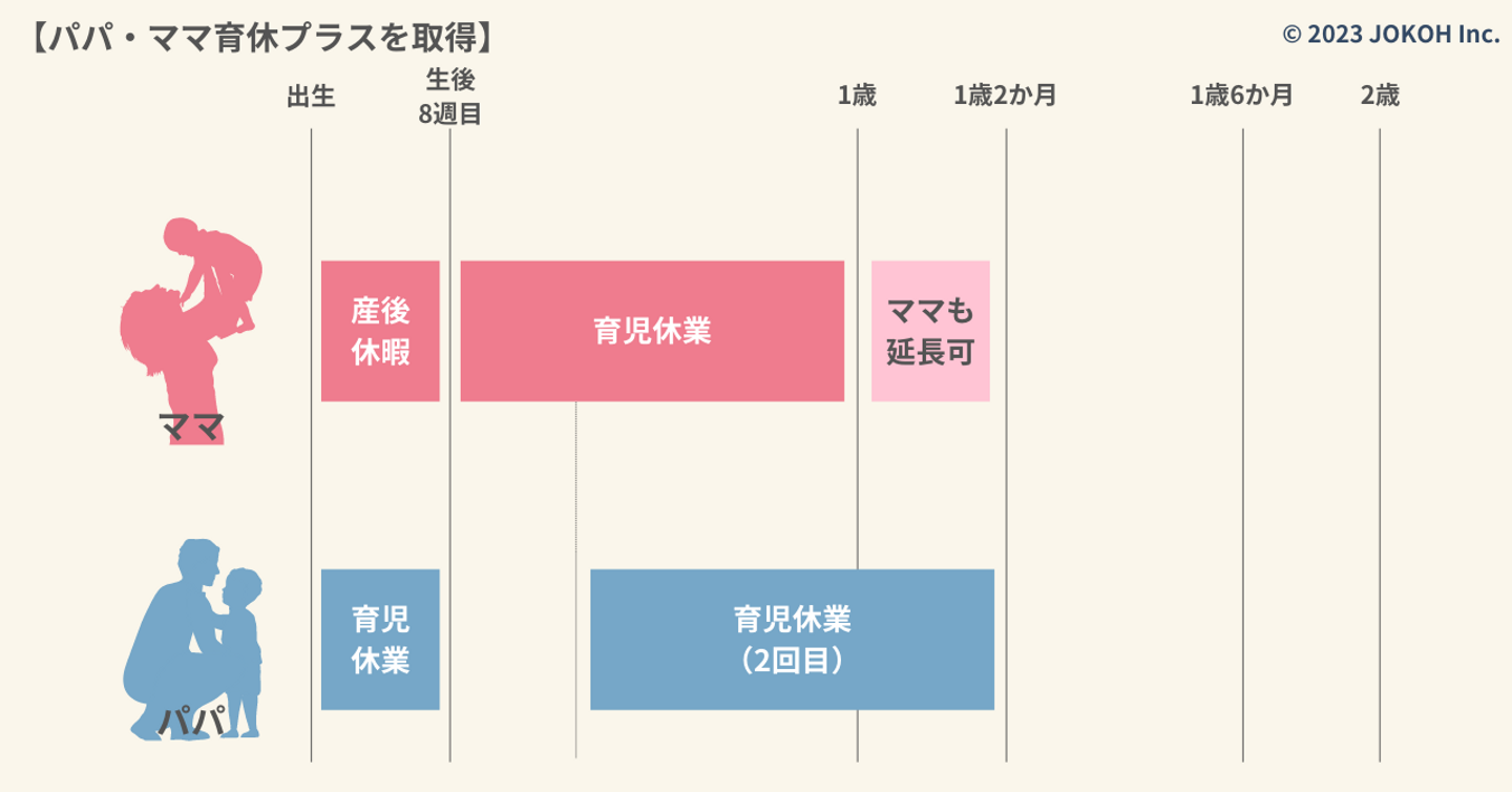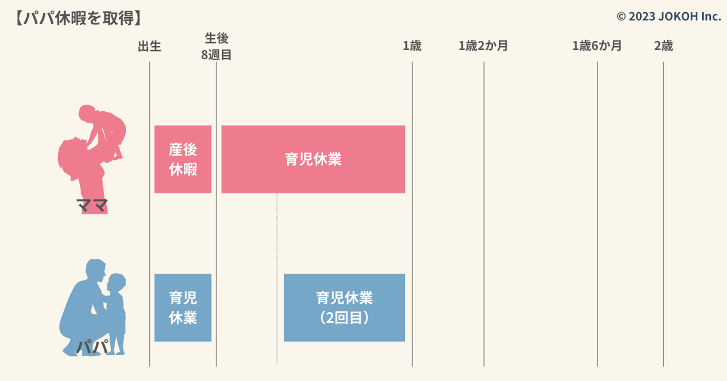 ママが産後休暇終了の翌日から育児休業を取得し、パパは子どもが生まれた日から8週間以内に育児休業を取得。産後パパ育休、通称パパ休暇のパターンです。