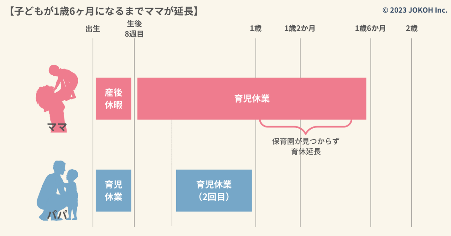子どもを預ける保育園が見つからない場合には、1歳6か月まで育児休業を延長できます。上記の画像では、ママが育児休業を延長していますが、もちろんパパが延長することも可能です。