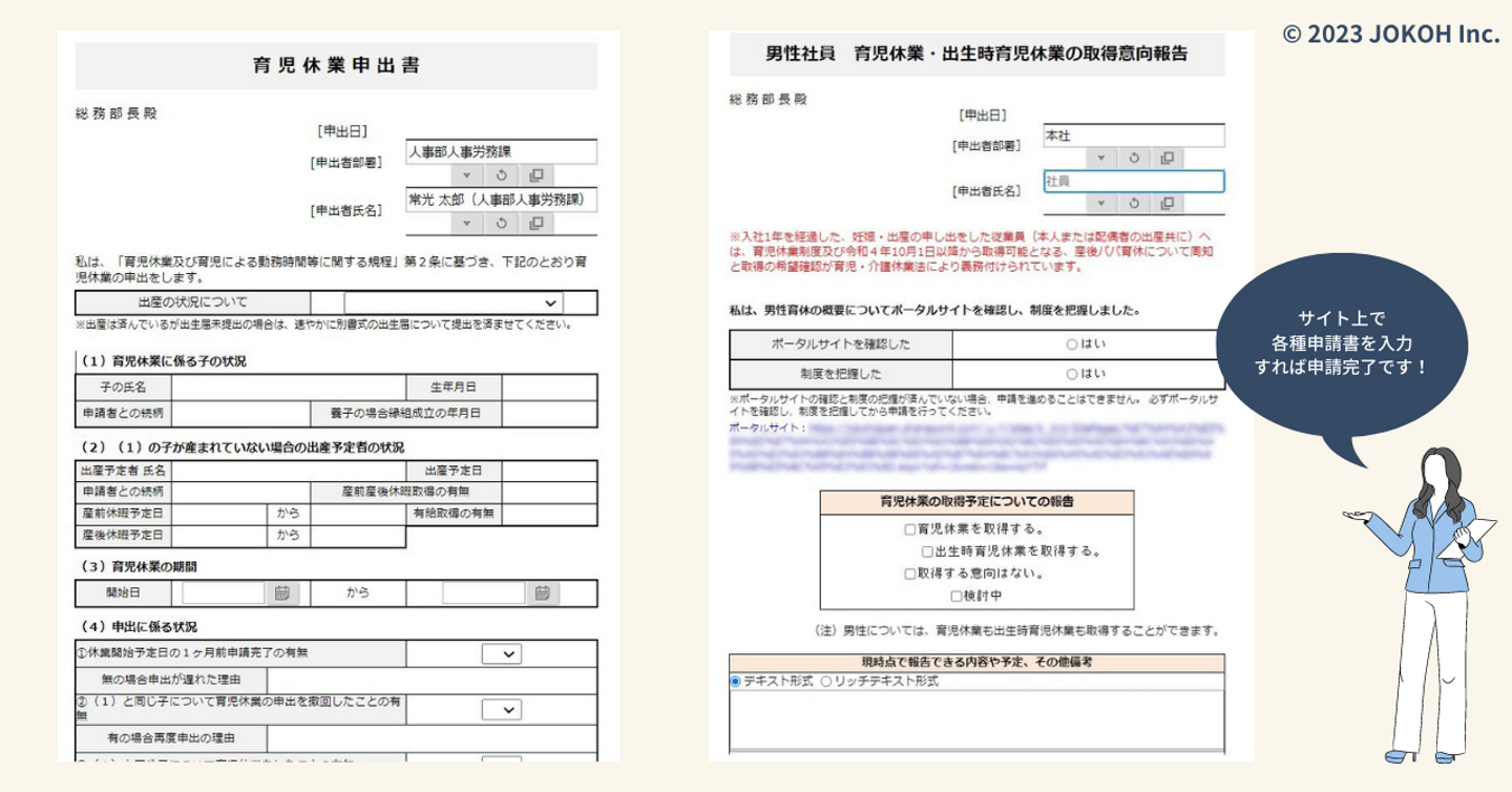 申請も社内ポータルサイト上で完結でき、必要事項を入力すれば「育児休業取得のための申し出」ができます。復職後の復帰支援面談シートもポータルサイトで入力可能です。