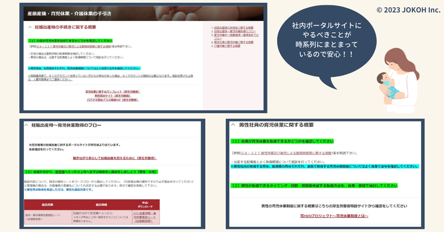 常光の社内ポータルサイトには、出産〜休業〜復帰まで状況にあわせてフローがまとめられています。厚生労働省の案内とも紐づいており、自分の状況にあわせて必要な行政の書類の取得など、ここを見れば一通りの理解が進むサイトです。
