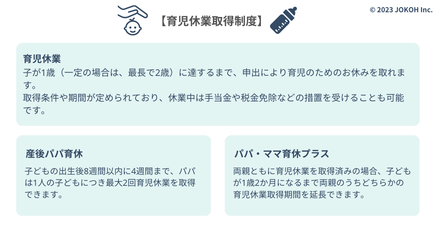 「日本の育児に関する制度は充実している」と前述しましたが、具体的にはどんな制度があるのかまとめてみました。もちろん、常光でもきちんと運用している制度です。
