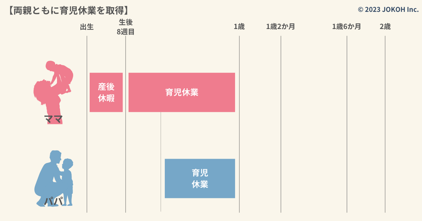 ママが産後休暇終了の翌日から育児休業を取得し、パパも子どもが1歳になるまでに育児休業を取得するパターン。夫婦の育児休業取得時期は、重複していても離れていても大丈夫です。