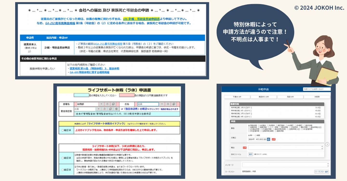 しかし、特別休暇は「申告制」であるものも多く、基本的には取得を必要とする従業員からの申し出をいただくものです。とはいえ、知らなければ申請することもできませんし、休暇ごとに申請フローが異なるという現状もあります。