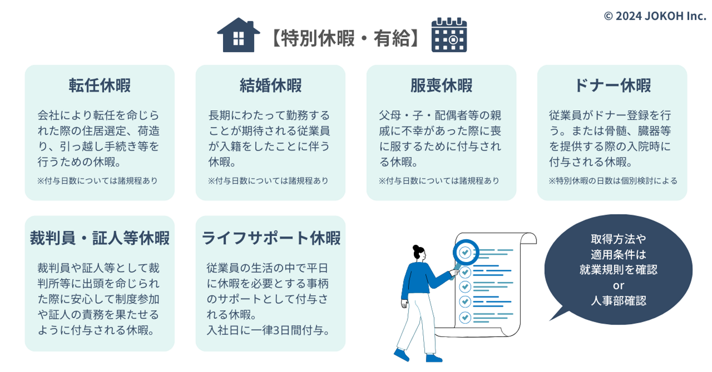 とくに直近追加された「ライフサポート休暇」は勤続年数によらずに付与されるため、まだ有給休暇が付与されていない場合でも自身や家族の疾病による通院や看護・介護、出産立ち会いなどの生活において支援が必要な休暇を取得できます(ライフサポート休暇の取得は規程で定める事項に該当する必要があります)。「急に子どもが発熱した」「親が入院して看病しないといけなくなった」そんなときに活用してほしい休暇です。