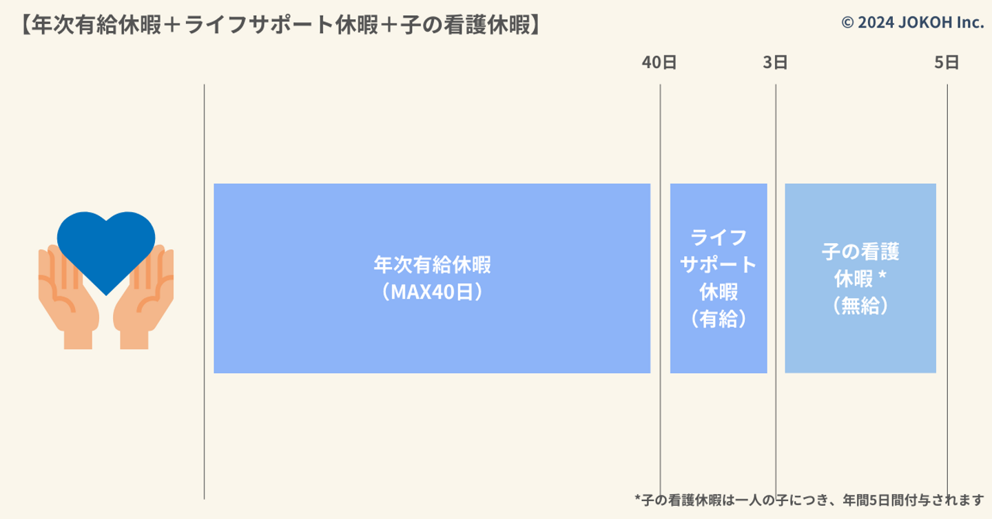 有給休暇の上限である40日が残っていれば、ライフサポート休暇の3日、子の看護休暇の5日を組み合わせて、合計48日のお休みを得られます(有給43日、無給5日)。大きいですよね。
