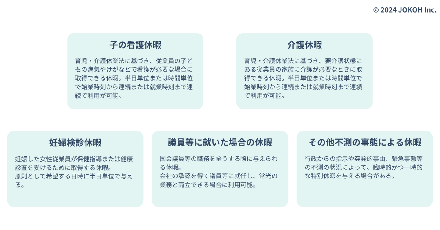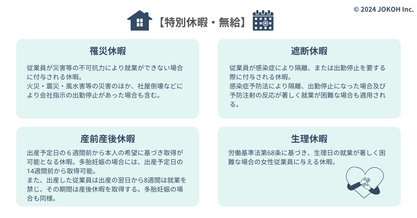 無給の特別休暇は9種類。災害時や感染症罹患時に取得できるものや産前産後休暇などもあり、いざという時にも安心して休めるようになっています。