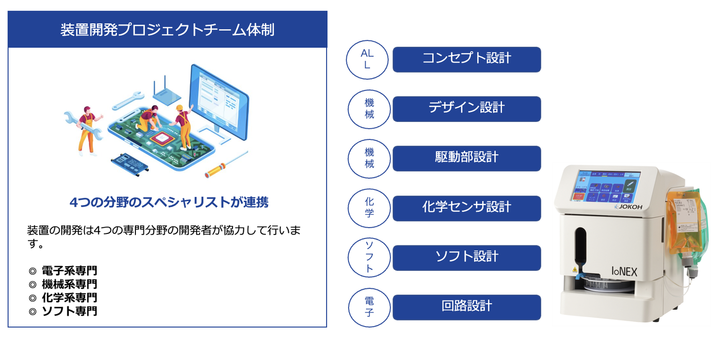 装置開発のプロジェクトでは、私が担当している電子設計以外にもデザイン・駆動部等の設計を担う機械設計の専門家や装置を動かすためのソフト設計をする専門家、さらには薬品を扱う観点で化学分野の専門家が連携することになります。
