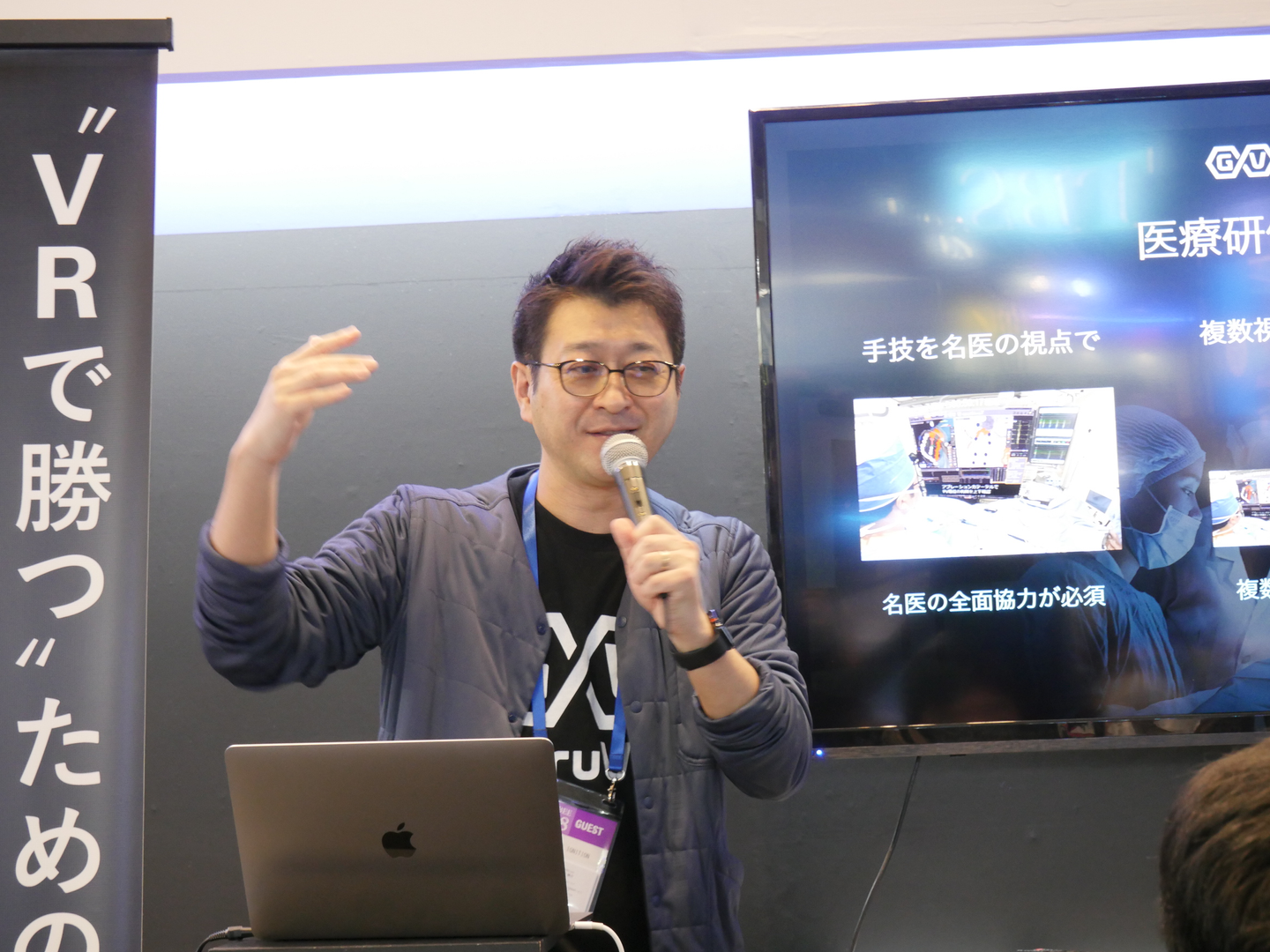90分のステージの前半パートでは、上路が登壇し、VRでちゃんと稼ぐ為のポイントとして、弊社の最新事例である医療研修VRを含むVRの活用事例や、現在のVRビジネスの動向など最新の情報をお話しました。