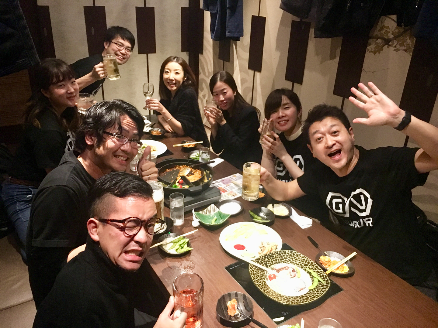 一度オフィスに戻っていた上路も駆けつけてくれて、皆で大成功だったInter BEEとお誕生日のお祝いです🍻