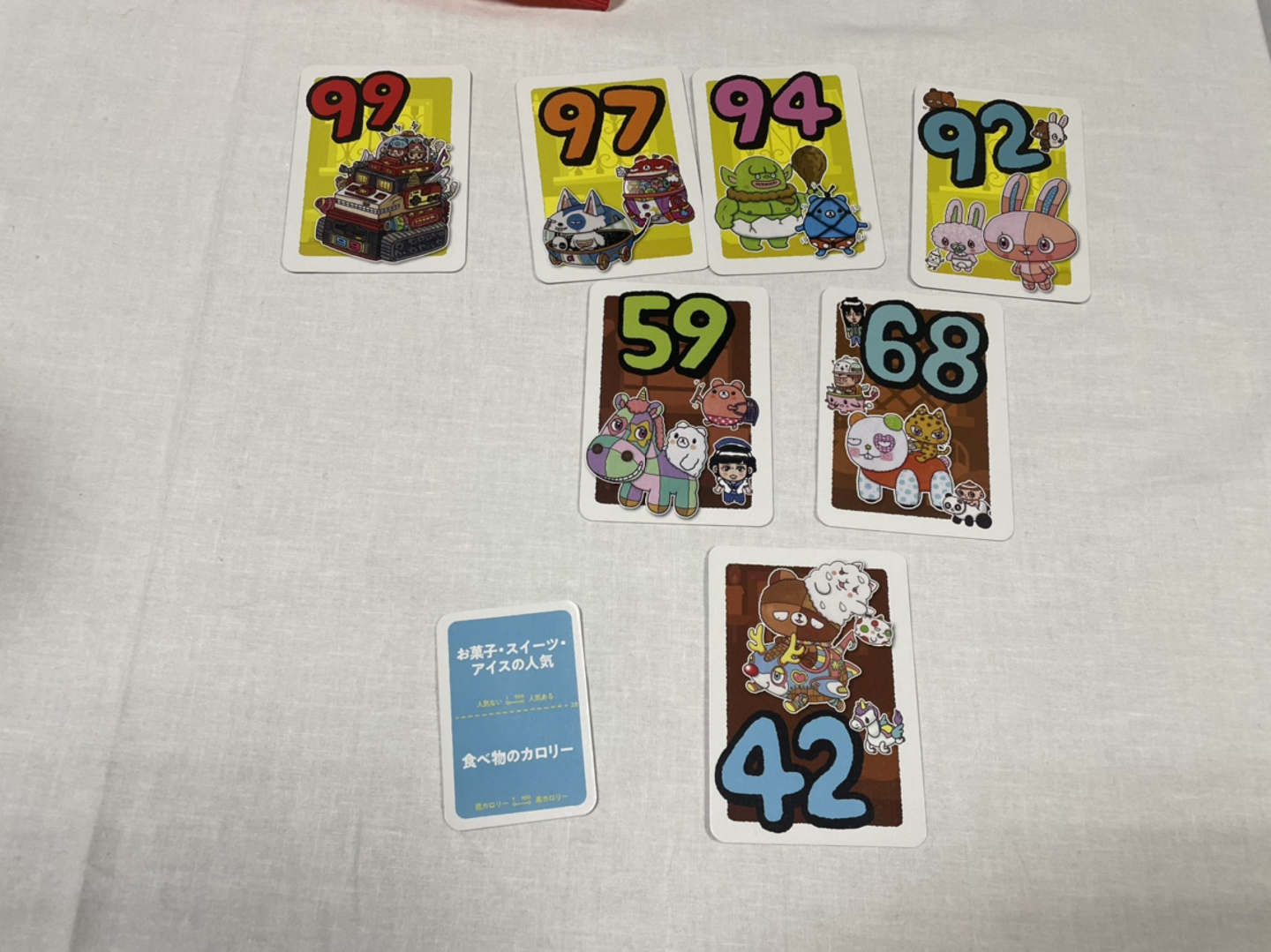 これは「食べ物のカロリー」というお題の時のみんなの手持ちのカードです。92、94、97、99と刻んできたにも関わらず、「揚げバター」を例にとって自分の手持ちのカードを表現しきり、見事クリアしました!!素晴らしいチームワークでした!