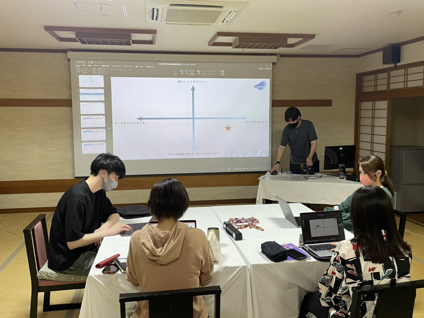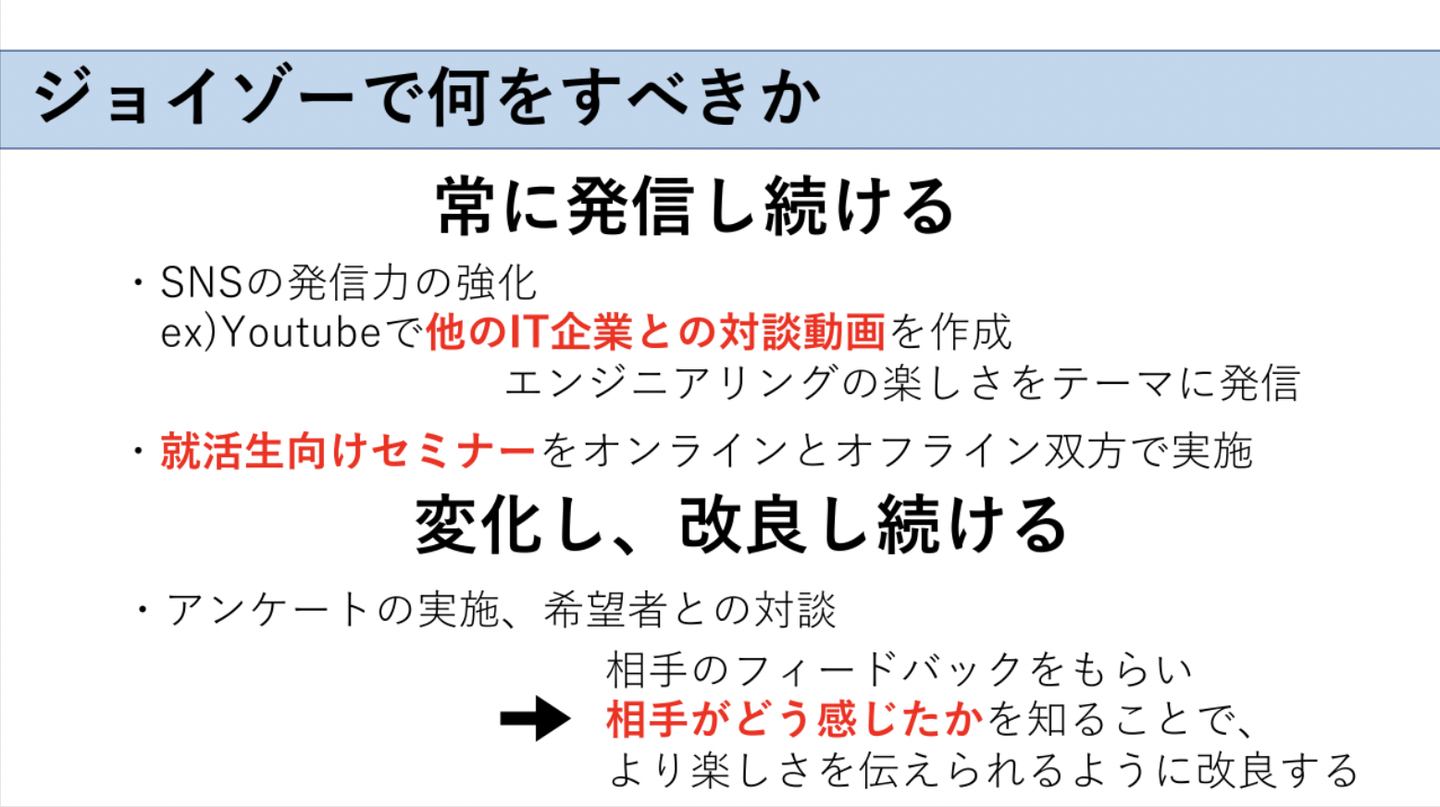 プレゼンのテーマは「世界の隅々に、エンジニアリングの楽しさを届けるためにジョイゾーは何をすべきか、また自分達は何ができるか」でした。