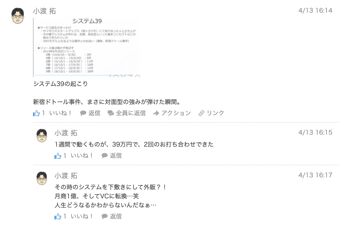 システム39のモデルとなるような案件、通称新宿ドトール事件・・・。なんとも危険な香りがしますが、カフェでさっとシステムを作ってお見せしたというまさに「事件」のような、ビジネスモデル誕生秘話でした。