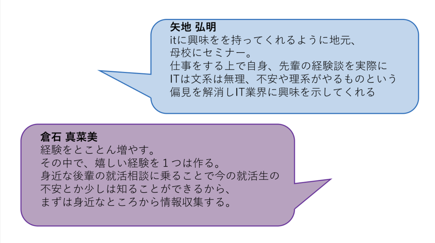 先輩方からは、全体的にまとまっているというご意見の他、バリューとアクションが結びついていないというご意見もいただきました。このご指摘は、「議論の軸がぶれている」という2日目の議論の反省点が原因の1つだと思いました。