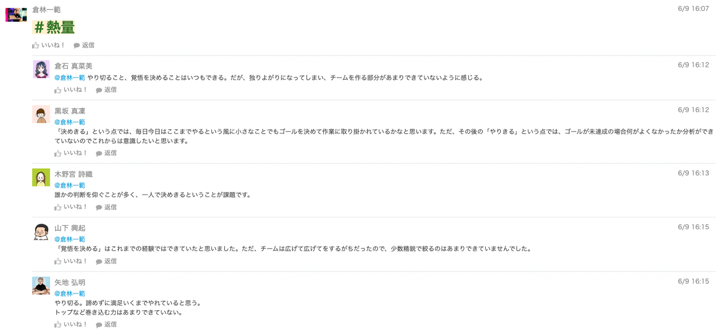 このように、kintoneのスレッドでチャット機能を使いワークショップを行いました。画像では、熱量のポイント6つの中で、自分で出来ていると思った事、出来ていないと思っている所を、実体験を踏まえながら記入するという事をしています。その後口頭でどのような実体験だったのかを話してから、他の人に質問も行い理解を深めました。
