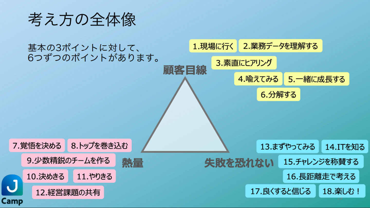 しかし、一言でDXをすると言ってもやる事は沢山あります。なのでJ Campでは、初めの一歩という事でDXに必要な要件である業務改善について学びました!