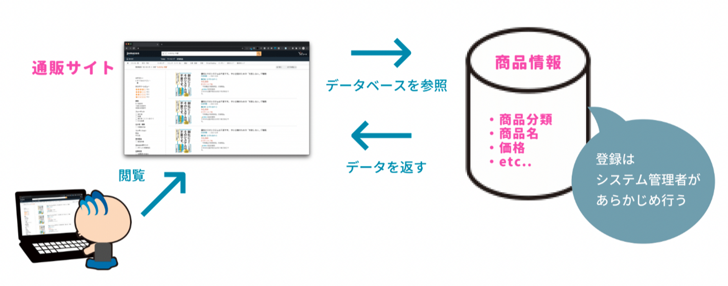 ECサイトを例とすると、ECサイトでは大量の商品情報を登録しておく必要があります。そしてお客様が本を検索したら、高速にデータベースから本を取り出します。この登録や編集などの機能を持つシステムがデータベースです!