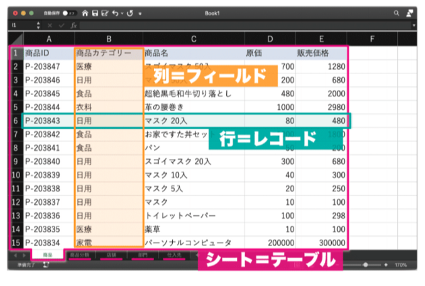Excelで言うシートのことをテーブル、行のことをレコード、列のことをフィールドと呼びます。一つのテーブルに「商品」「ユーザー」などと言った、関連性のある一連のデータを格納します。またデータを管理しやすいように、「テーブル内にどのようなデータを格納しているのか?」を表す属性を設定します。商品のテーブルであれば「商品名」「販売価格」などです。