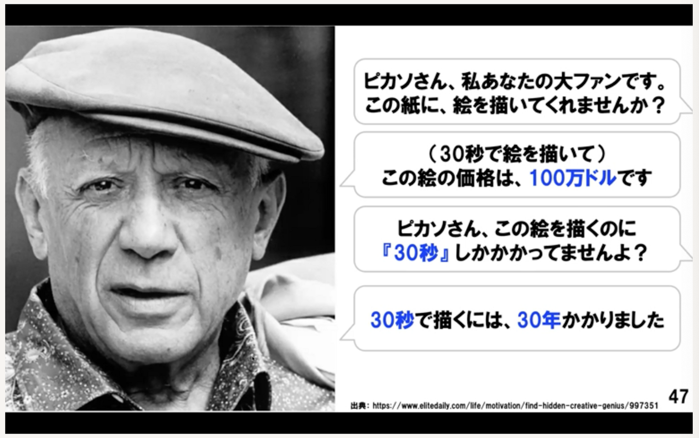 ここでは、ピカソを例に教えてくださいました。上にも書いてあるとおり、「30秒で書くために30年かかった」というこの発言は、私たちでいうと「kintoneでシステム構築する時は短時間で進められるかもしれませんが、そこに至るまでにたくさんの時間を費やして技術を習得した」ということになります。