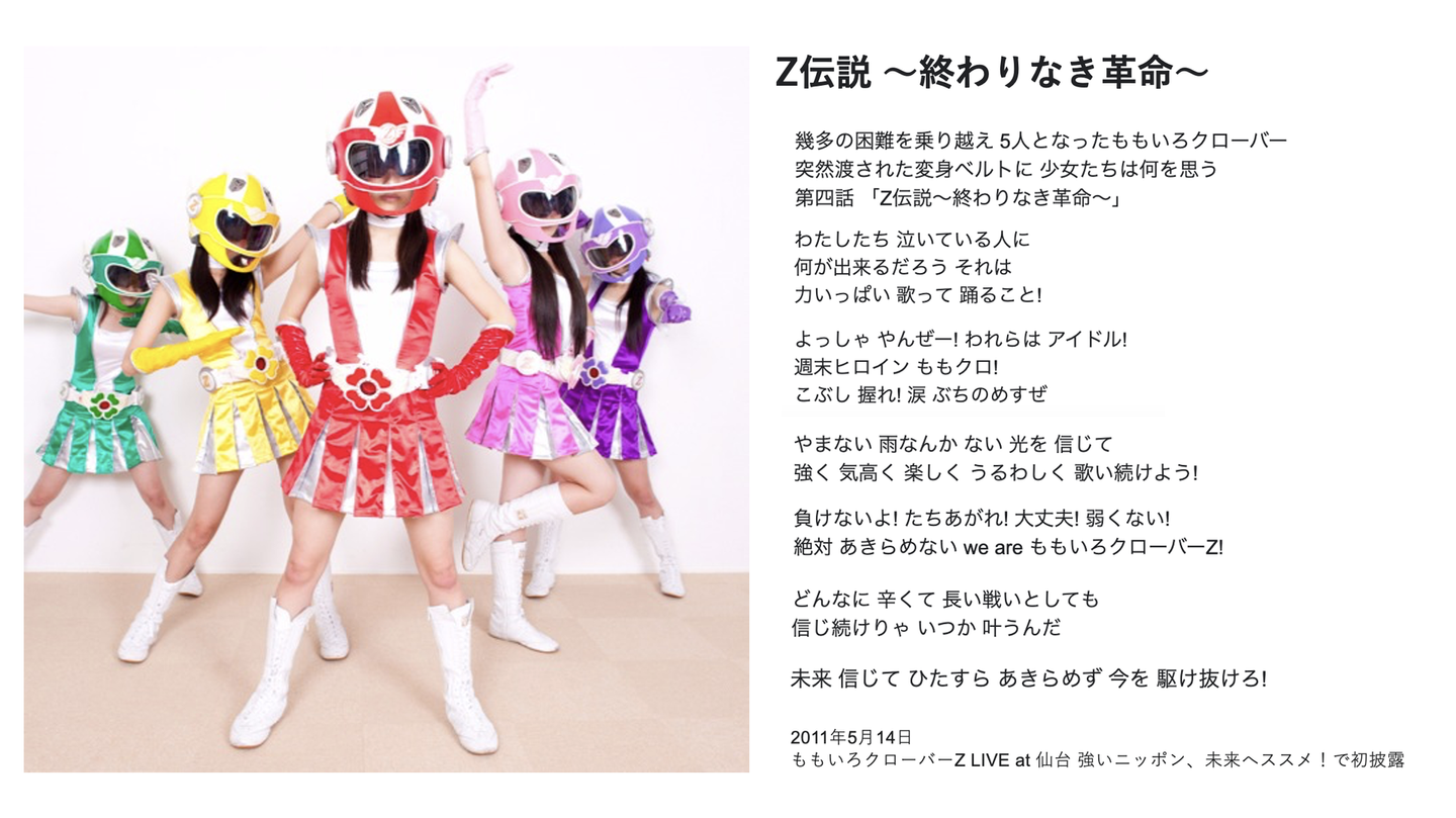 早見あかりが抜け6人から5人になったももクロを見た川上さんは、ゴレンジャーの設定で女性アイドルの顔にヘルメットを被せ、世間の度肝を抜かせます。時代は2011年5月。その時に出来た歌が「Z伝説〜終わりなき革命」という曲だったそうです。