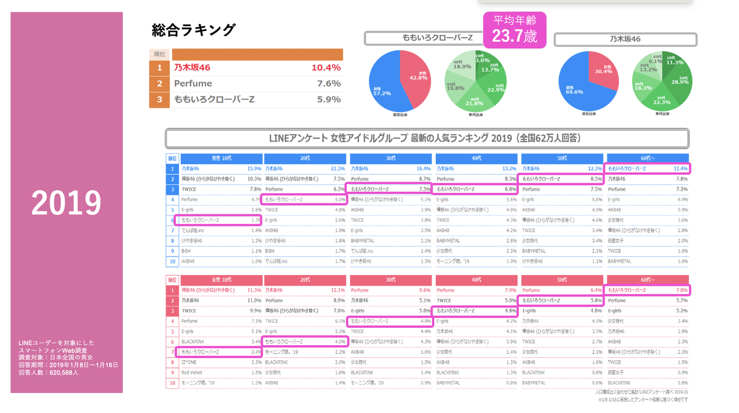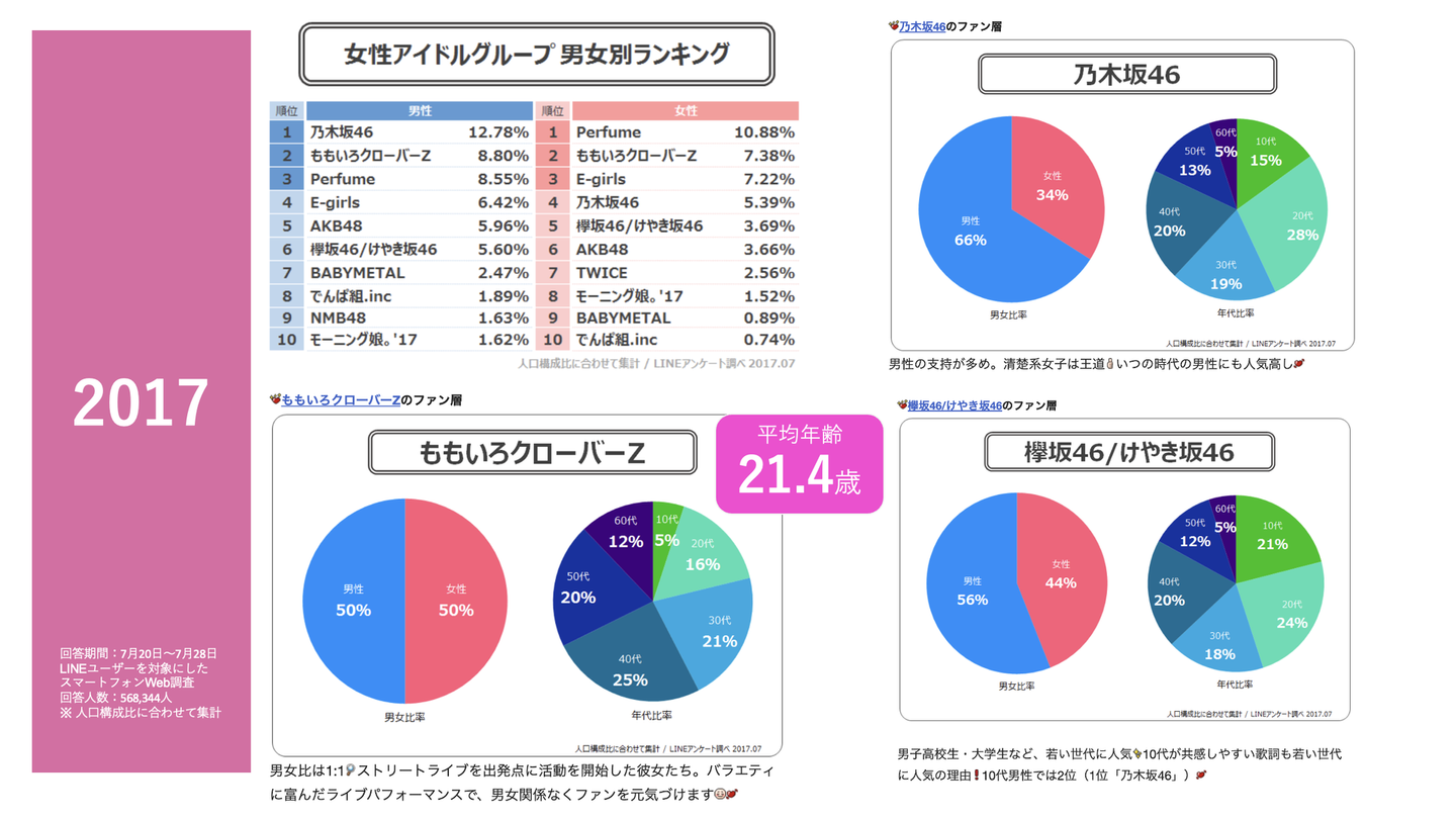 ↑2017年時点の上のデータを見ると、ももクロは男女共に人気があることがわかります。