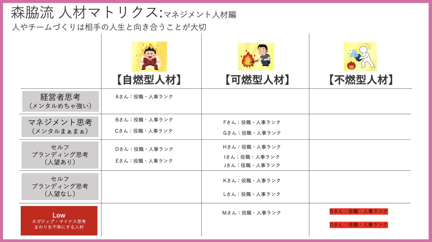森脇さんは社内でタレントマネジメント(将来の幹部候補)を考える上で、主力メンバーを下の図のような軸で細分化し、それぞれのメンバーをどのように将来の経営者として育てていくか考えているという話をしてくれました。