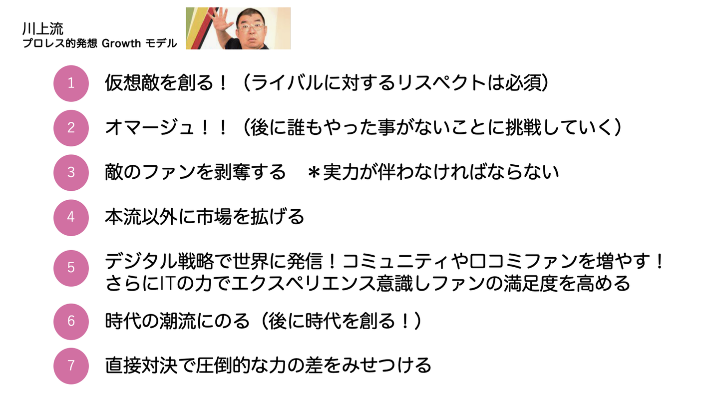 以下は川上流、プロレス的発想を森脇さんがまとめたものです。事業戦略的な要素を柱としつつ、エンターテイメントな発想と徹底した実力主義を貫く姿勢を感じます。