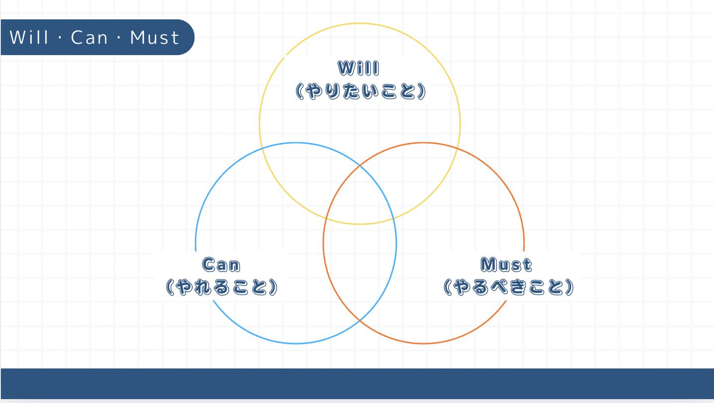 CanとMustで世の中は回る(ビジネスが生まれる)と言われています。しかし、それにWill(やりたいこと)を加えたらもっと幸せだと思いませんか?