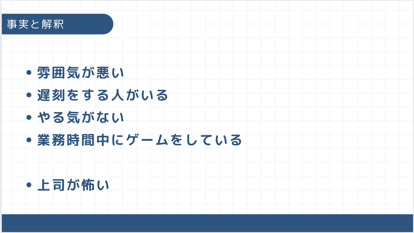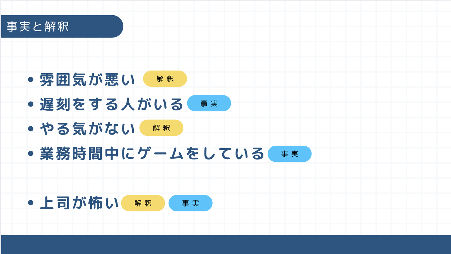 決して「事実」だけで議論すべきという訳ではなく、感覚に近い「解釈」も大事ということです。重要なのは、今話していることが「事実」なのか「解釈」なのかを理解することです。
