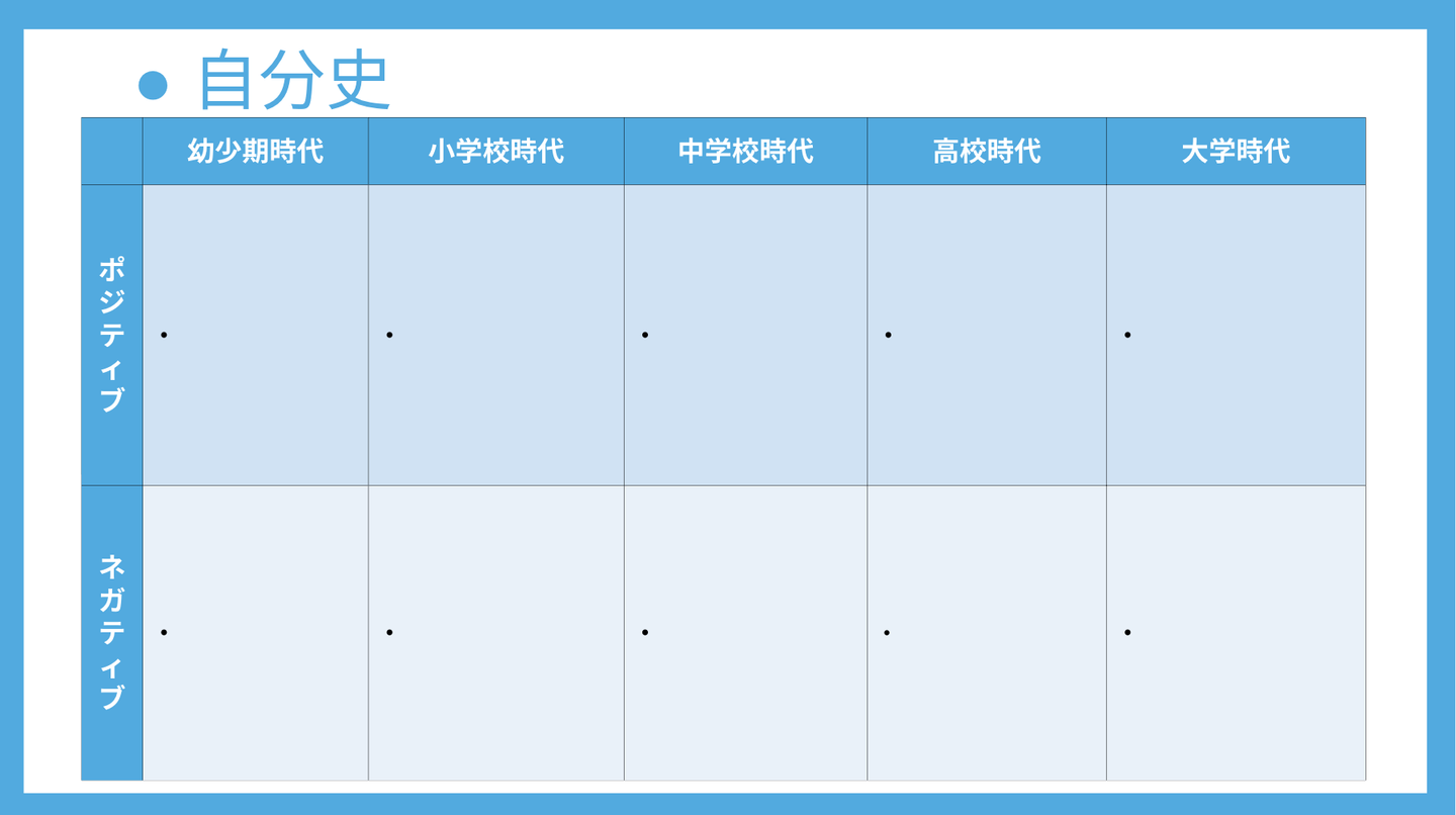 自分史は就活生なら誰もが行うワークで、幼少期から現在に至るまでの経験をポジティブとネガティブの観点から記入します。ちなみに、私の自分史から理解できた価値観は「自由で正直」「行動力と発信力」「創造性と探究心」でした。