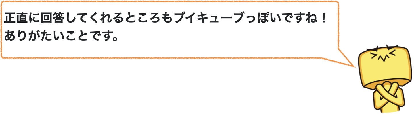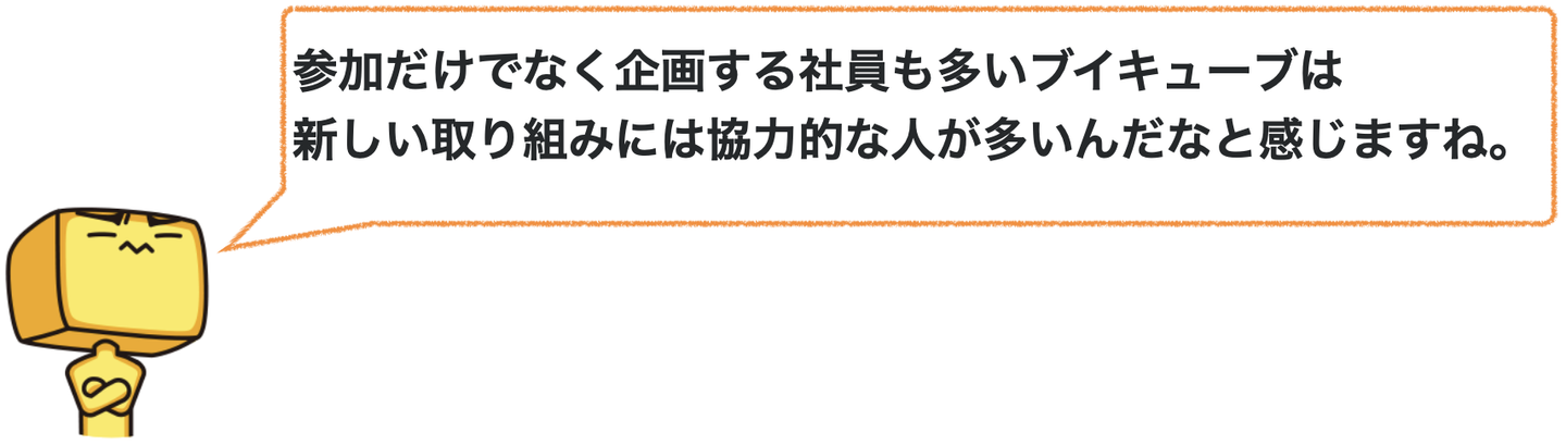 この記事を通して、ブイの日のことだけでなく、ブイキューブで働くことに興味がある方には、「ブイキューブって挑戦に前向きなんだ」とか「ブイキューブは協力的な人が多いんだ」と思っていただき、少しでもブイキューブの良さが伝われば文化や雰囲気などが伝われば幸いです!