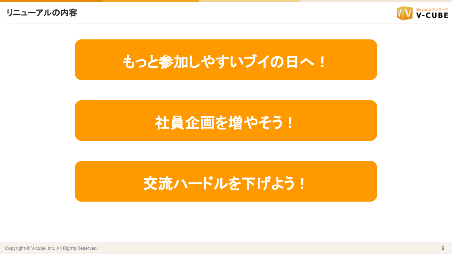 ということで、ブイの日の活性化、つまり社内のオンラインコミュニケーションを活性化させていくためにも、 社員の皆さんからいただいた意見を参考にブイの日のリニューアルを全社に向けて発表しました。