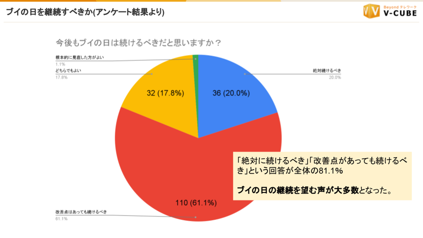 試行錯誤しながら走り抜けてきたブイの日1年目でしたが、今後も継続すべきかどうかこれからのブイの日を考えるにあたり、一度振り返り(満足度アンケート)を全社向けに行いました。
