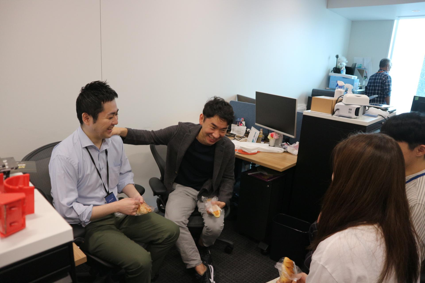 お昼はお弁当を社内で食べたり、天気の良い日には外に出て食べることもあります!