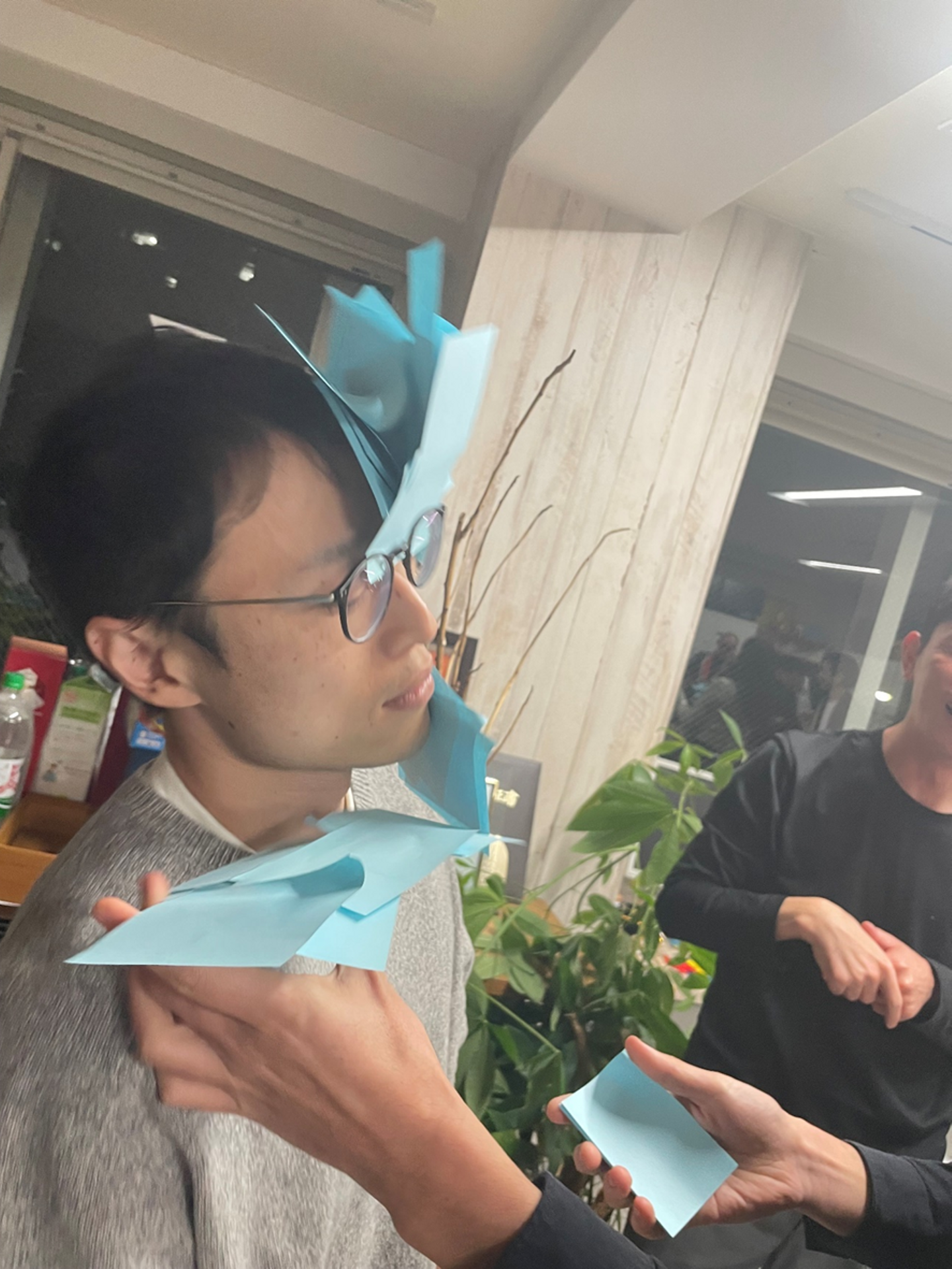 チームに分かれて、1分間で顔にどれだけ付箋を貼れるか競いました!