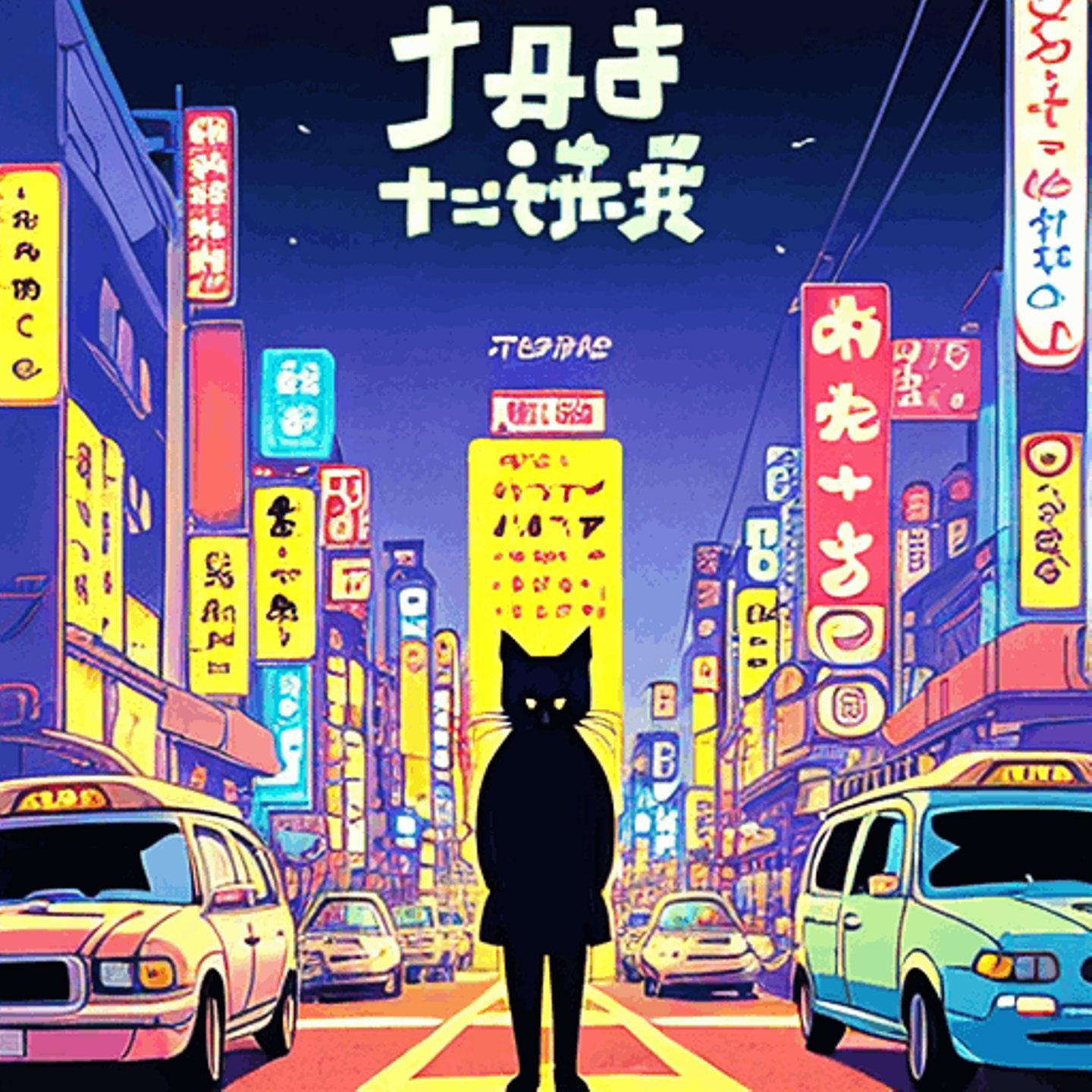 AIの画像生成はリアルタッチのイラストか3D表現になりがちだけど、アナログチックなテイストなのが新鮮に感じた。色鮮やかなネオン街の街並みと猫探偵の黒いシルエットのコントラストが怪しさも出していて、パッと見明るいイメージだけど、闇を感じさせるビジュアルにストーリーの中身が気になる仕上がりになっている。