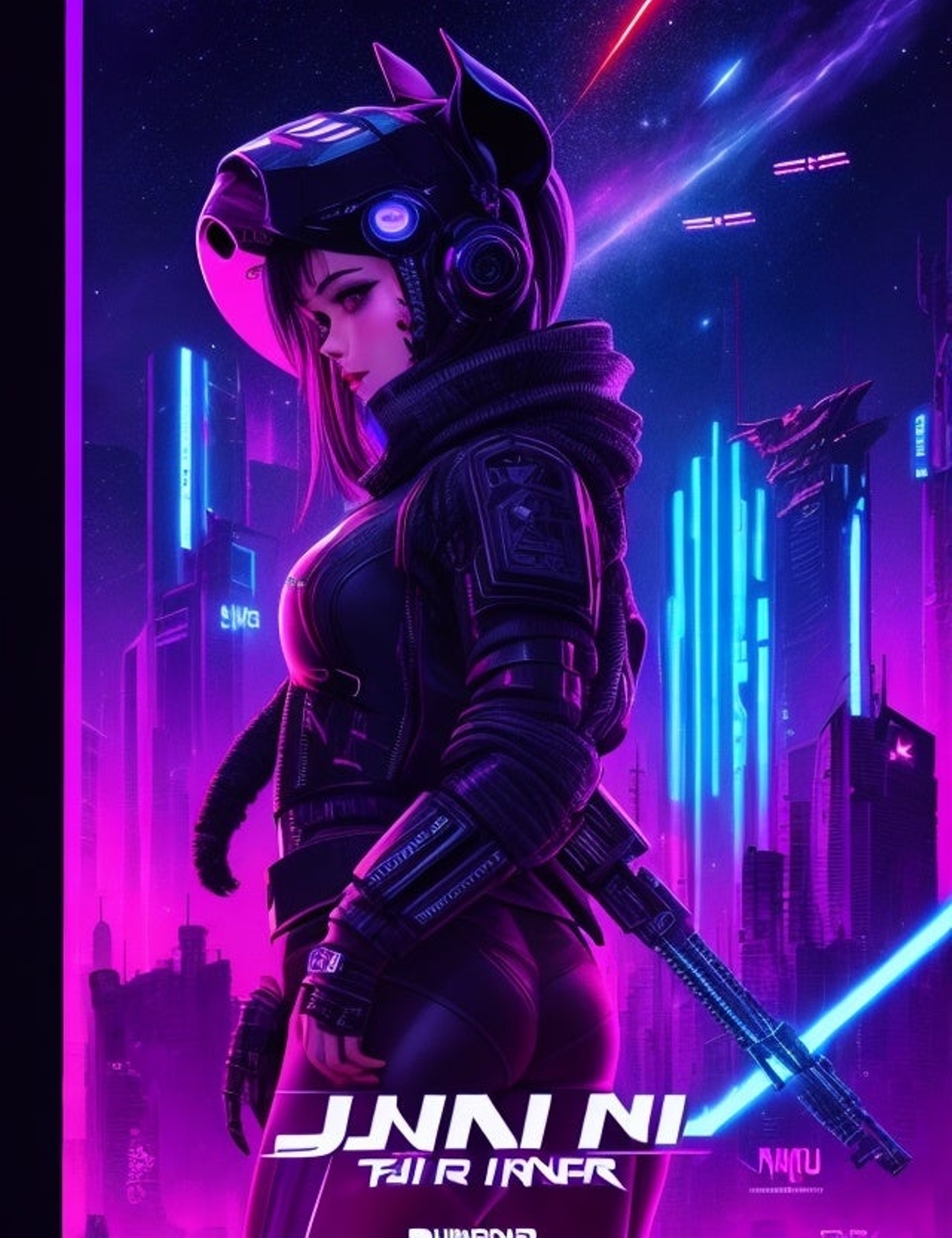 Movie Poster. title is "JUNNI". cyber punk city like Blade Runner. thre tapirs, night, using color black, red, blue, purple, shooting star. dancing people,
