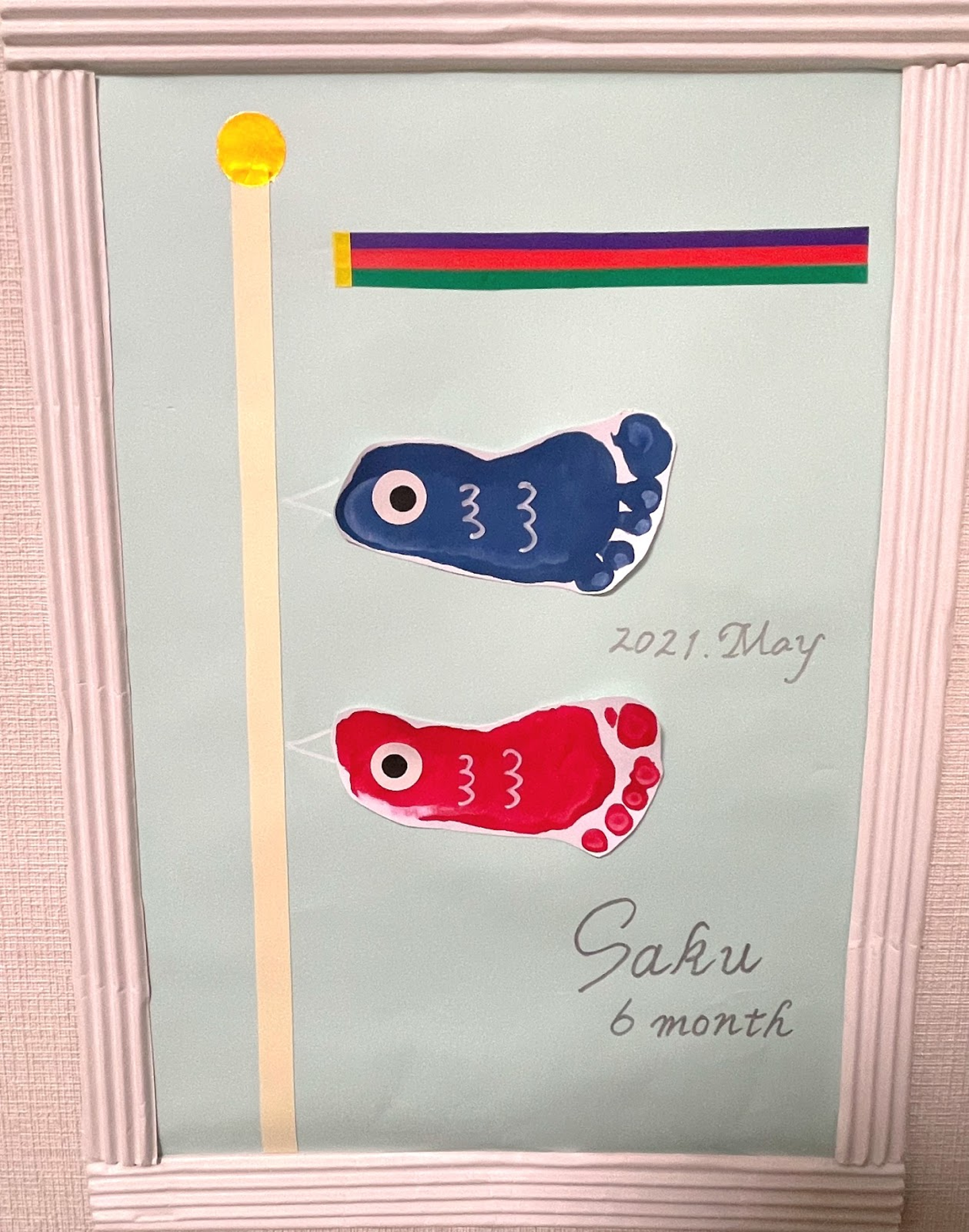PC作業台の目の前に「子どもの絵」が飾ってあります。子どもの足型になっている“鯉登り”がとても愛らしい作品です。誰でも落ち込むことはあると思いますが、そういう時に僕はこれを見て“原動力”に変えています。