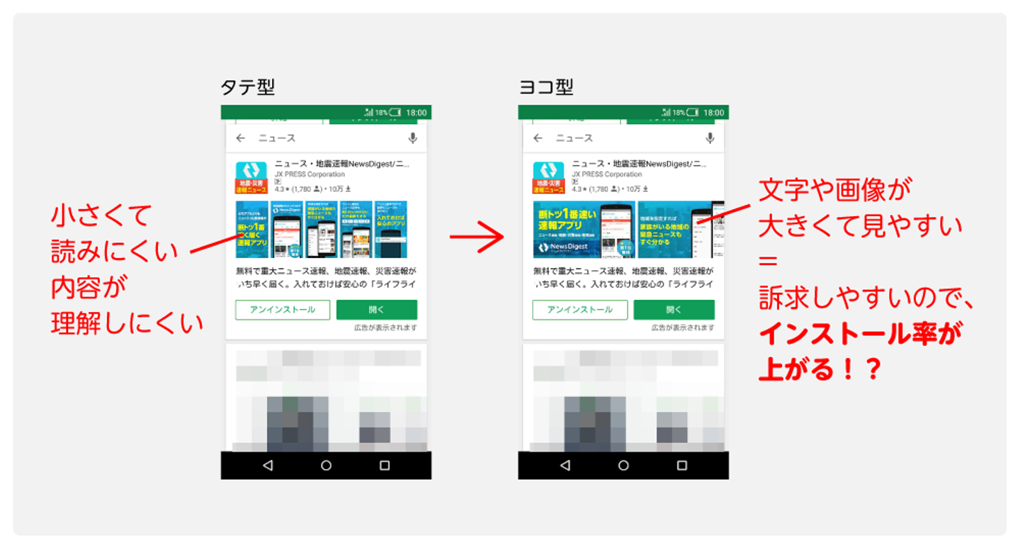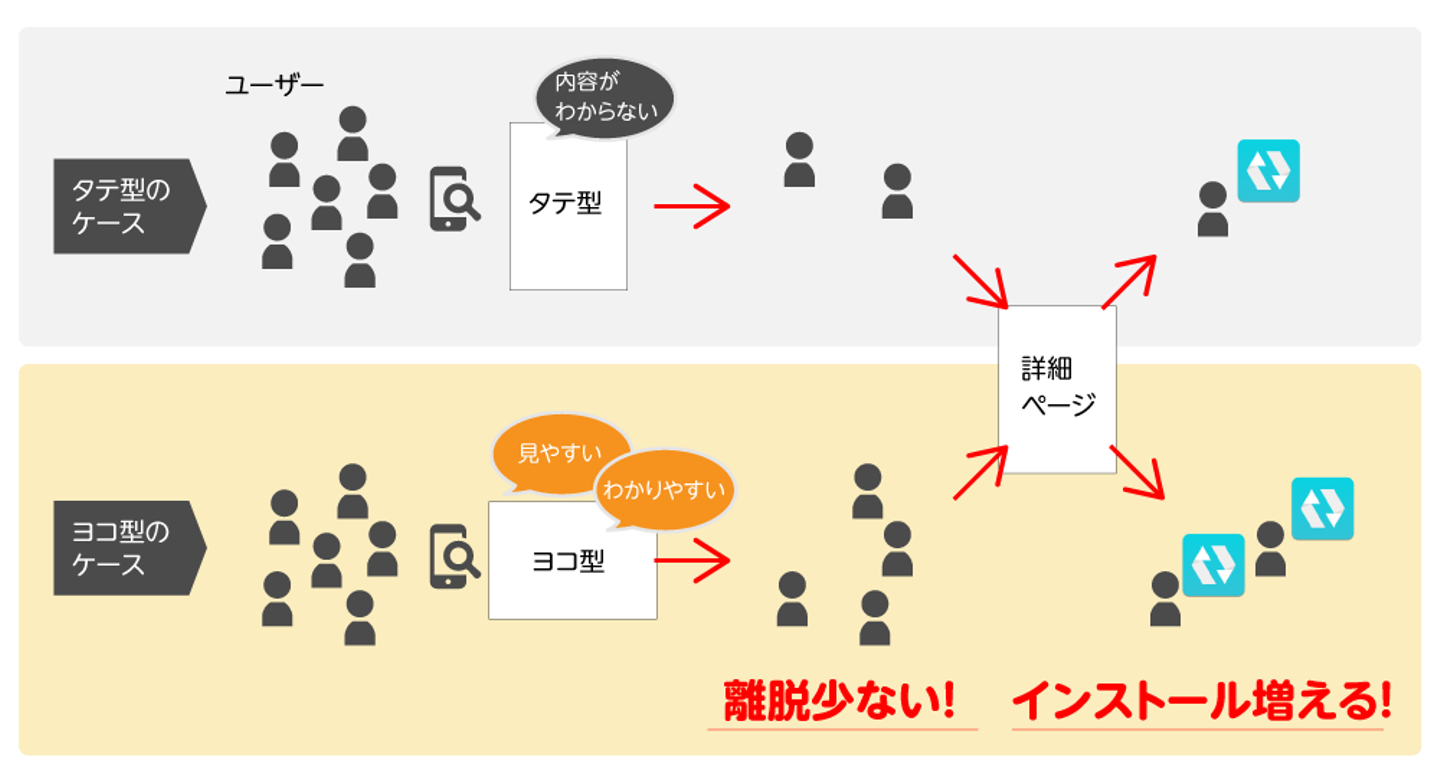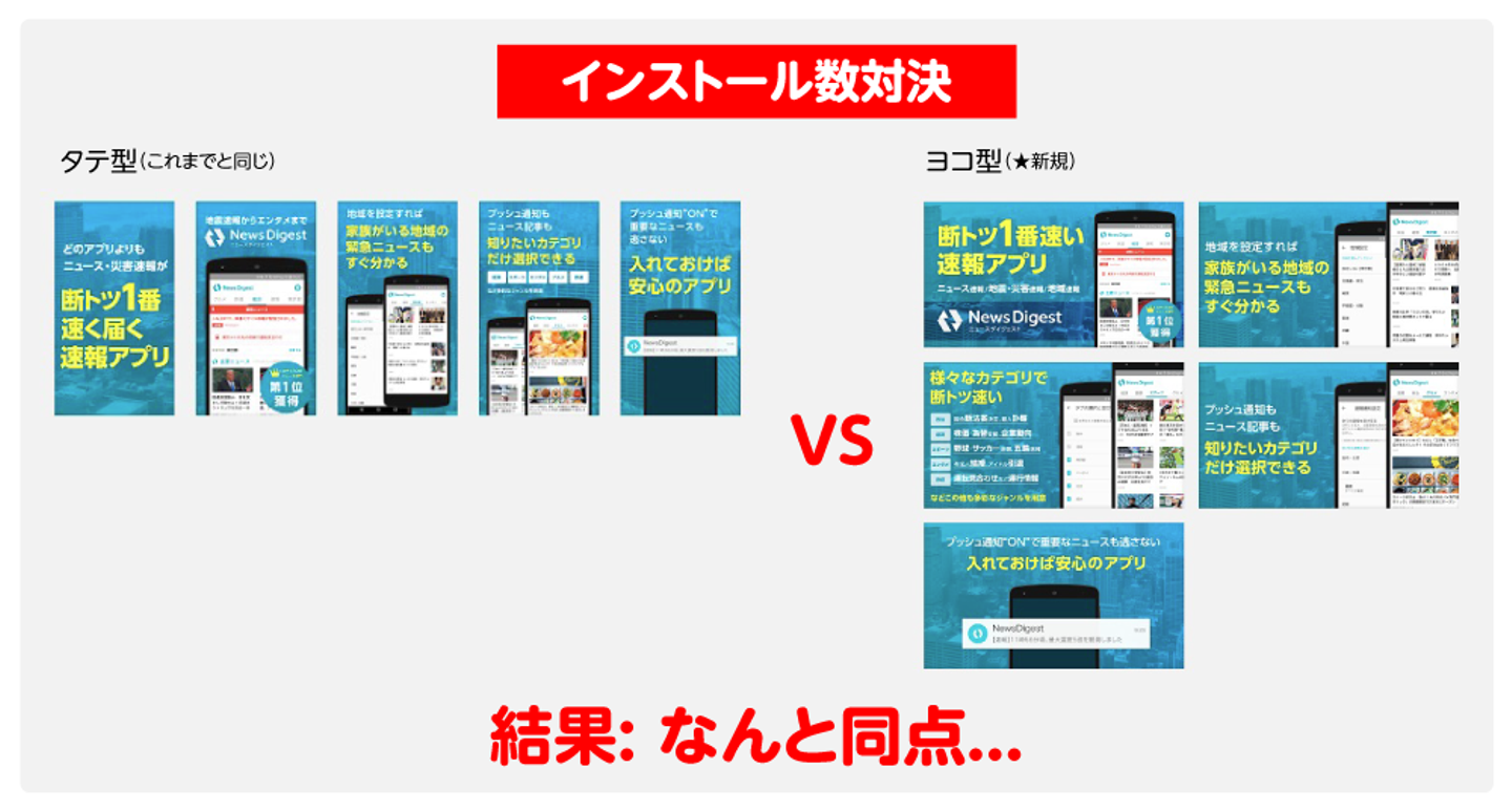 それならタテ型vsヨコ型でどちらがインストール率が高いか見てみよう!ということになったのです。